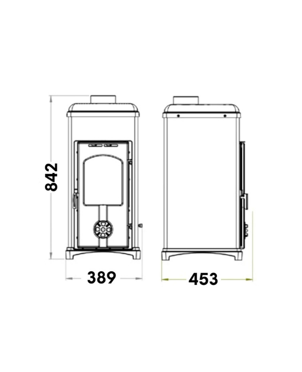 Geniş camlı tasarım, üç kademeli hava kontrolü ve %82.8 verimlilik ile 183 m³’e kadar alanlar için kompakt ve ekonomik odun sobası.